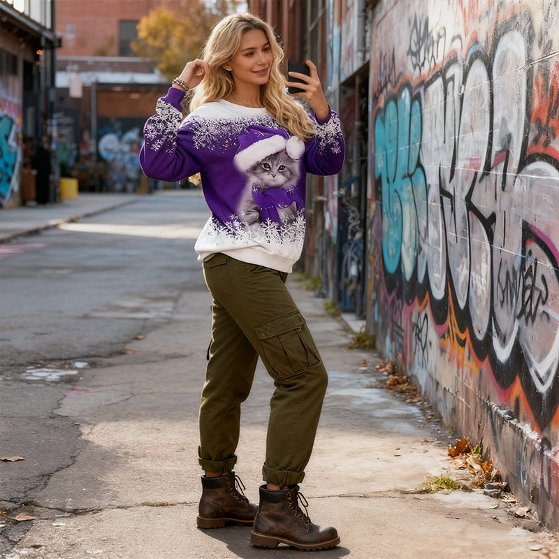✨🌸【S-8XL】 Świąteczna koszulka z długim rękawem i nadrukiem 3D z kotem