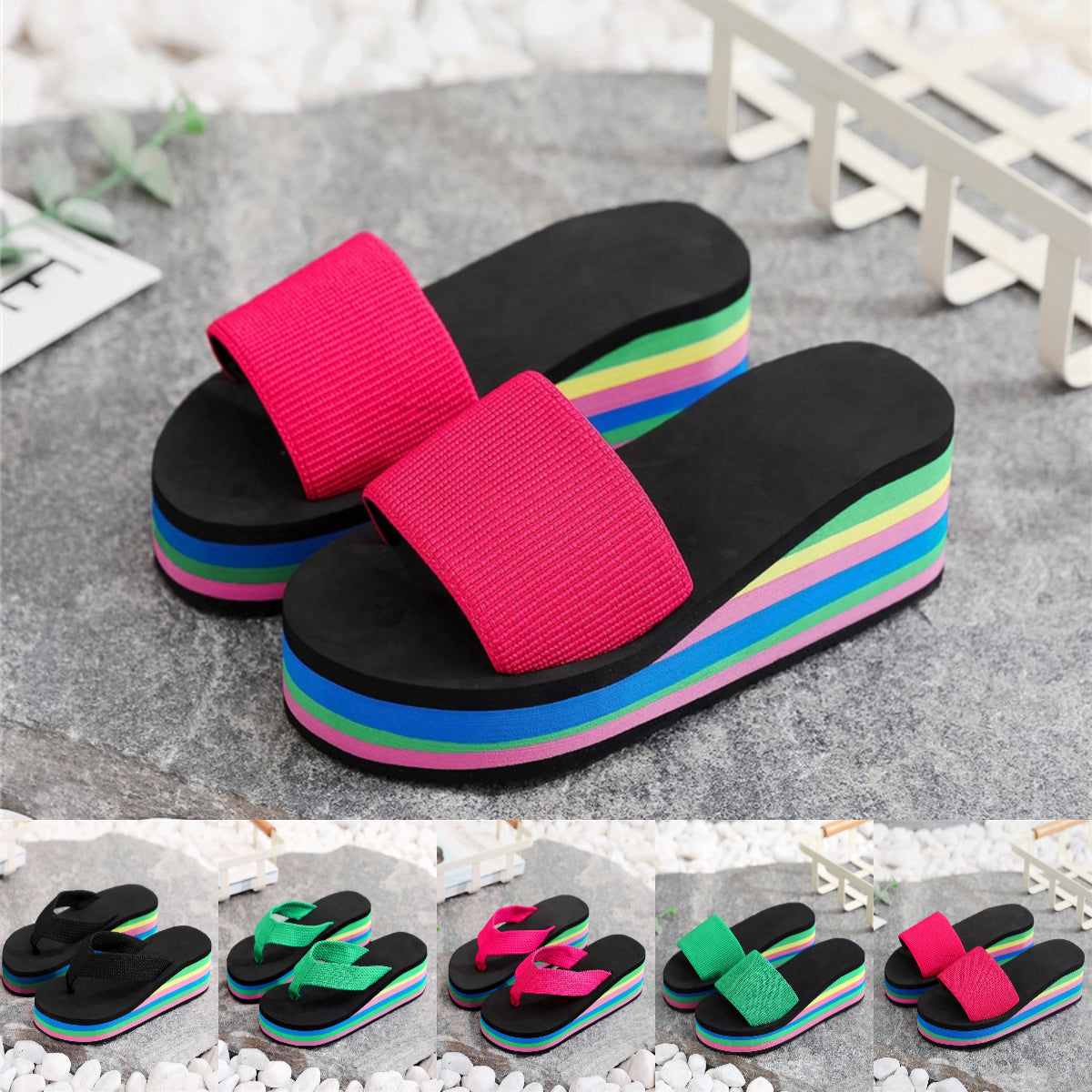 【Reducere 80% la fiecare pereche】Sandale curcubeu de vară cu talpă groasă pentru femei, papuci de plajă